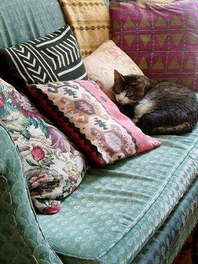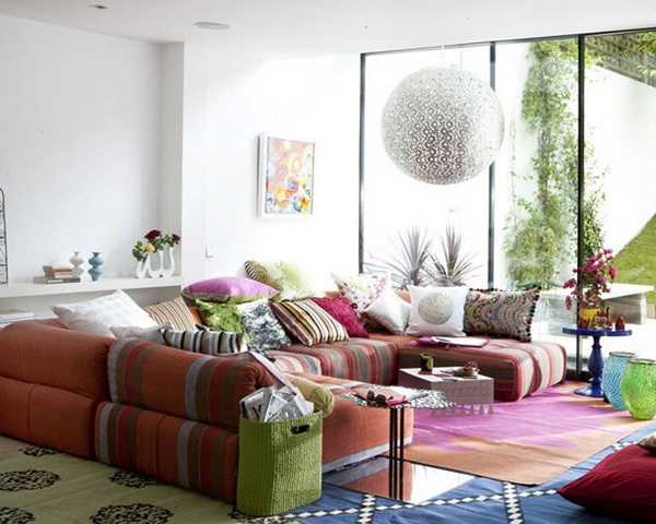 На диванах должно быть множество подушек различных форм, размеров и расцветок.
