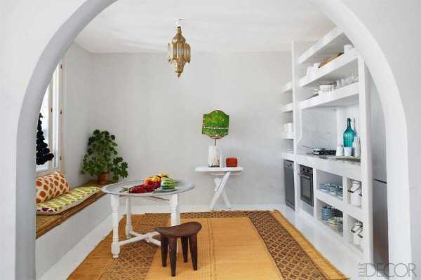 - при помощи гипсокартона легко можно сделать неглубокие стрельчатые или подковообразные ниши в стенах, а затем поместить в них полки с посудой, плиту или холодильник, а то и целую мебельную группу – диван и обеденный стол;