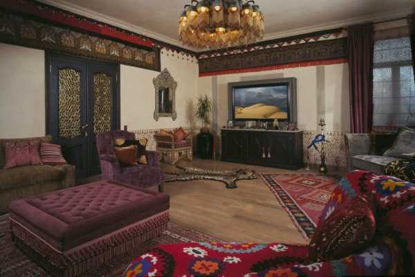Кроме того, она может быть резной, инкрустированной мозаикой, украшенной разнообразными узорами. Среди видов мебели преобладают диваны, тумбы, скамейки, кушетки, пуфики и низкие столики. На диванах должно быть множество подушек различных форм, размеров и расцветок. Самые распространенные материалы – органза, бархат, шелк.