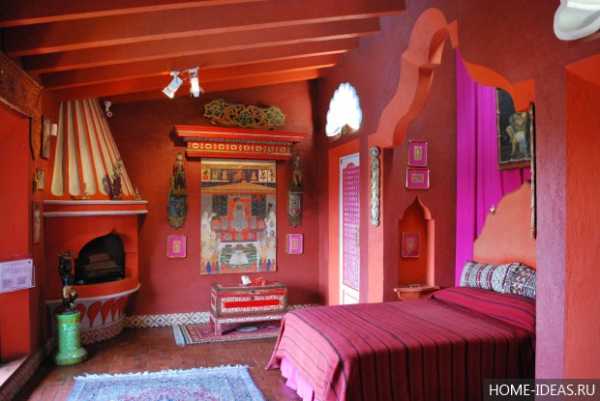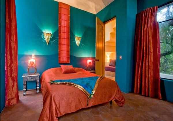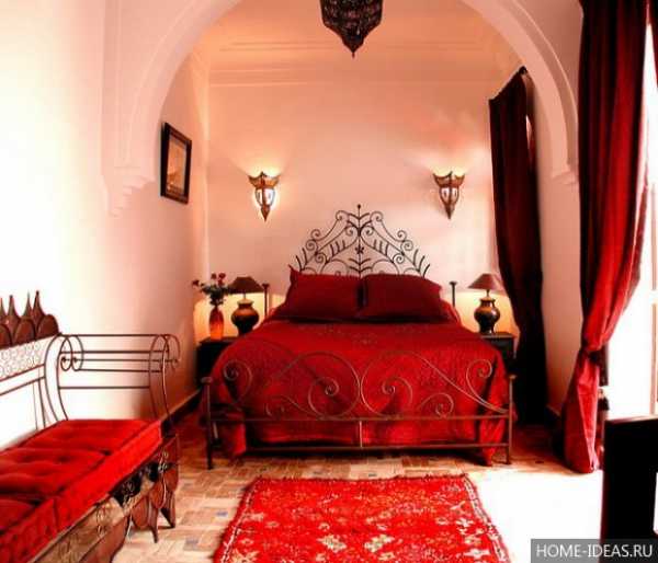 В качестве доминирующего цвета в марокканской спальне можно использовать и страстный красный.