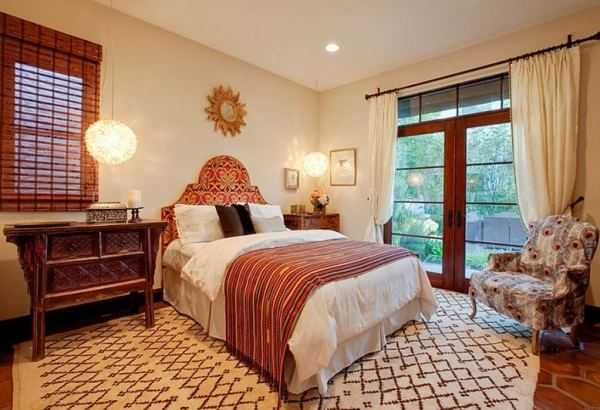 В цветовой гамме спальни в марокканском стиле проявляется колорит этой страны. При создании декора в этом направлении нужно задействовать «земляные» оттенки: охру, бронзу, шоколад.