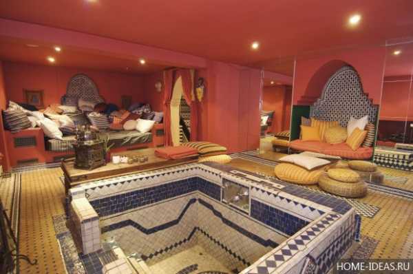 Один из излюбленных приемов в оформлении гостиной в марокканском стиле – размещение диванов на подиумах и в нишах. Это создает эффект особой доверительности и даже интимности общения, особой значимости дорогих гостей.
