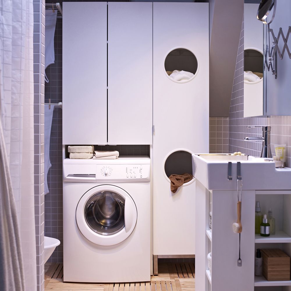 Если вы планируете ремонт ванной комнаты и хотите объединить в ней пространство для стирки, вам следует подумать о том, чтобы поставить стиральную машину и сушилку друг на друга, чтобы сэкономить место.Сегодня существует множество компактных стиральных машин, которые можно крепить к стене. С помощью индивидуального столярного решения вы можете создать достаточно места под или над вашей бытовой техникой для хранения корзины для белья или любых других предметов первой необходимости для стирки.