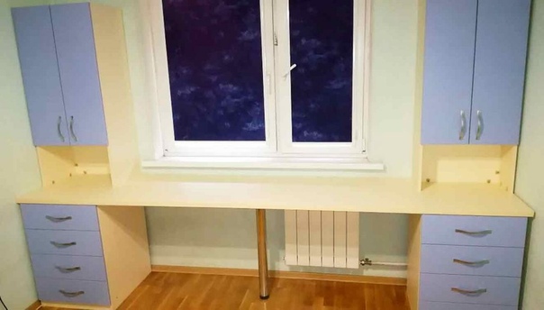 Чтобы каждому ребёнку в семье было удобно, необходимо сделать два рабочих места. В целях экономии пространства возможно использование широкого подоконника вместо обычного деревянного письменного стола.