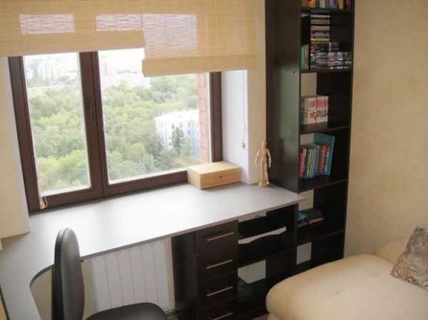 Встроенная столешница может иметь миниатюрные размеры и быть равной длине подоконника. Но если размеры комнаты позволяют, удачным решением является столешница вместо подоконника, переходящая в широкий компьютерный стол. При условии, что комната узкая, лучшим вариантом будет письменный стол-подоконник, расположенный на всю длину стены, на которой находится окно. А чтобы получился единый ансамбль, рядом повесьте книжные полки, выполненные из того же материала, что и столешница.