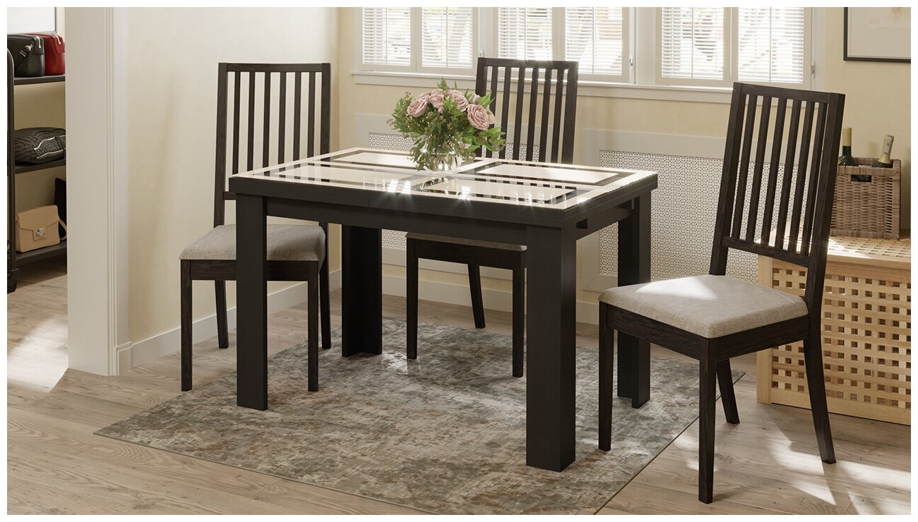 - Раздвижная модель, выполненная из массива дерева и МДФ, отделанного шпоном, и имеющая размеры 120×80 см, производства Малайзии.