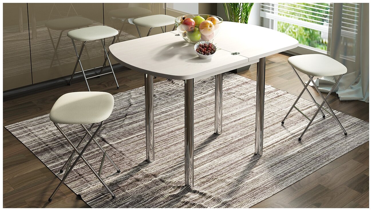 - Стол на хромированных металлических ножках, имеющий стеклянную раздвижную столешницу с фотопечатью. Размеры в сложенном виде — 70×90 см, в развёрнутом — 70×135 см; российского производства.