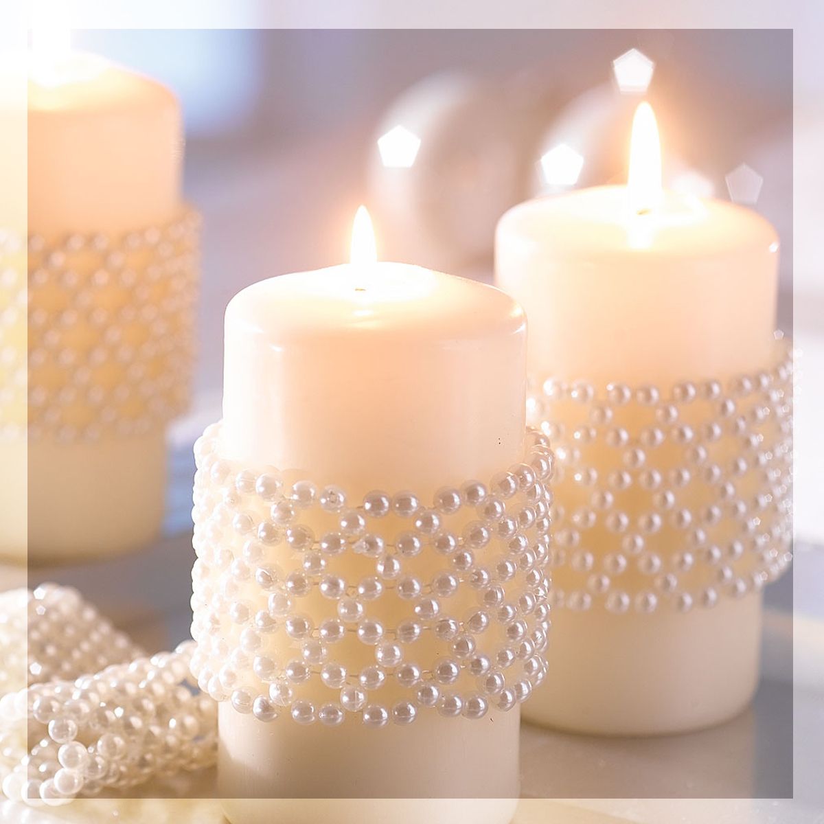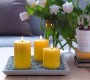 Можно дополнить кружевом или бечевкой и поставить на деревянный спил. Или поместить в стеклянную вазу, банку или прозрачный подсвечник, насыпав туда цветной песок, мелкую гальку, соль и т.д. Существуют и специальные подносы для свечей, помогающие в создании декоративных композиций.