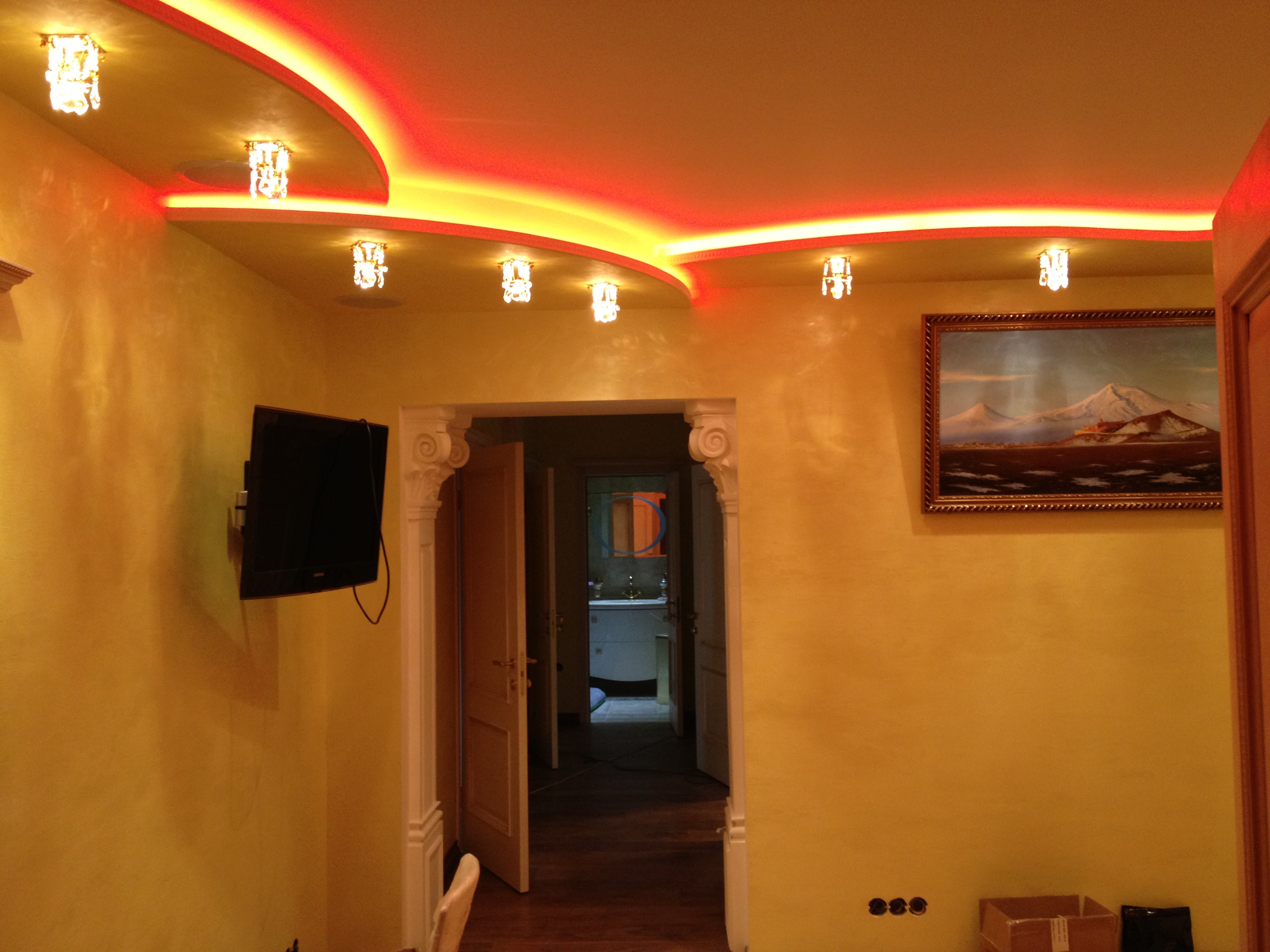 - можно пустить подсветку по потолку или имеющимся нишам.
