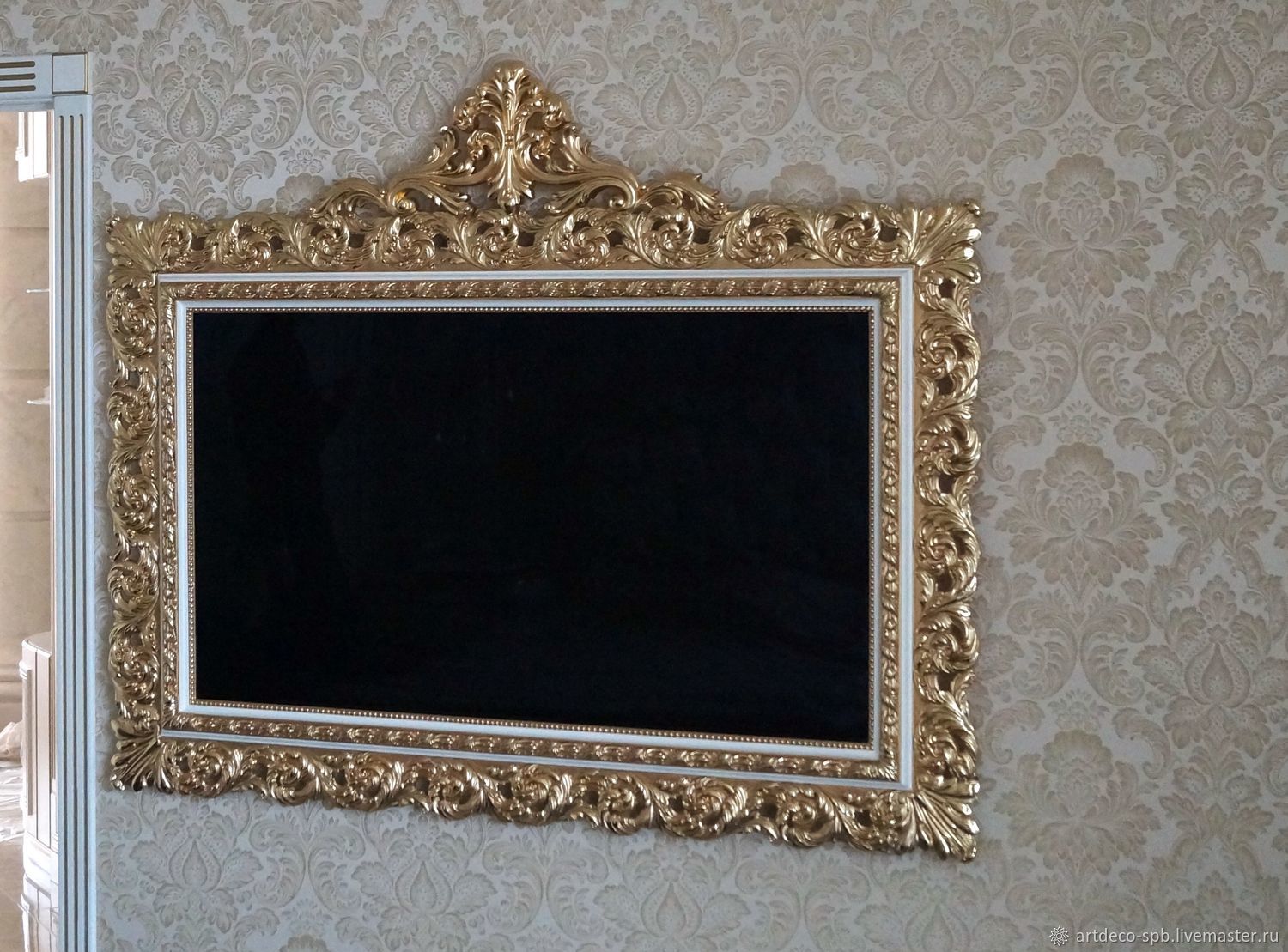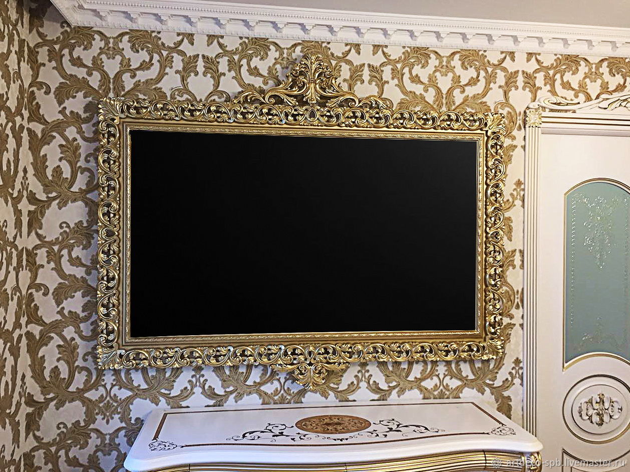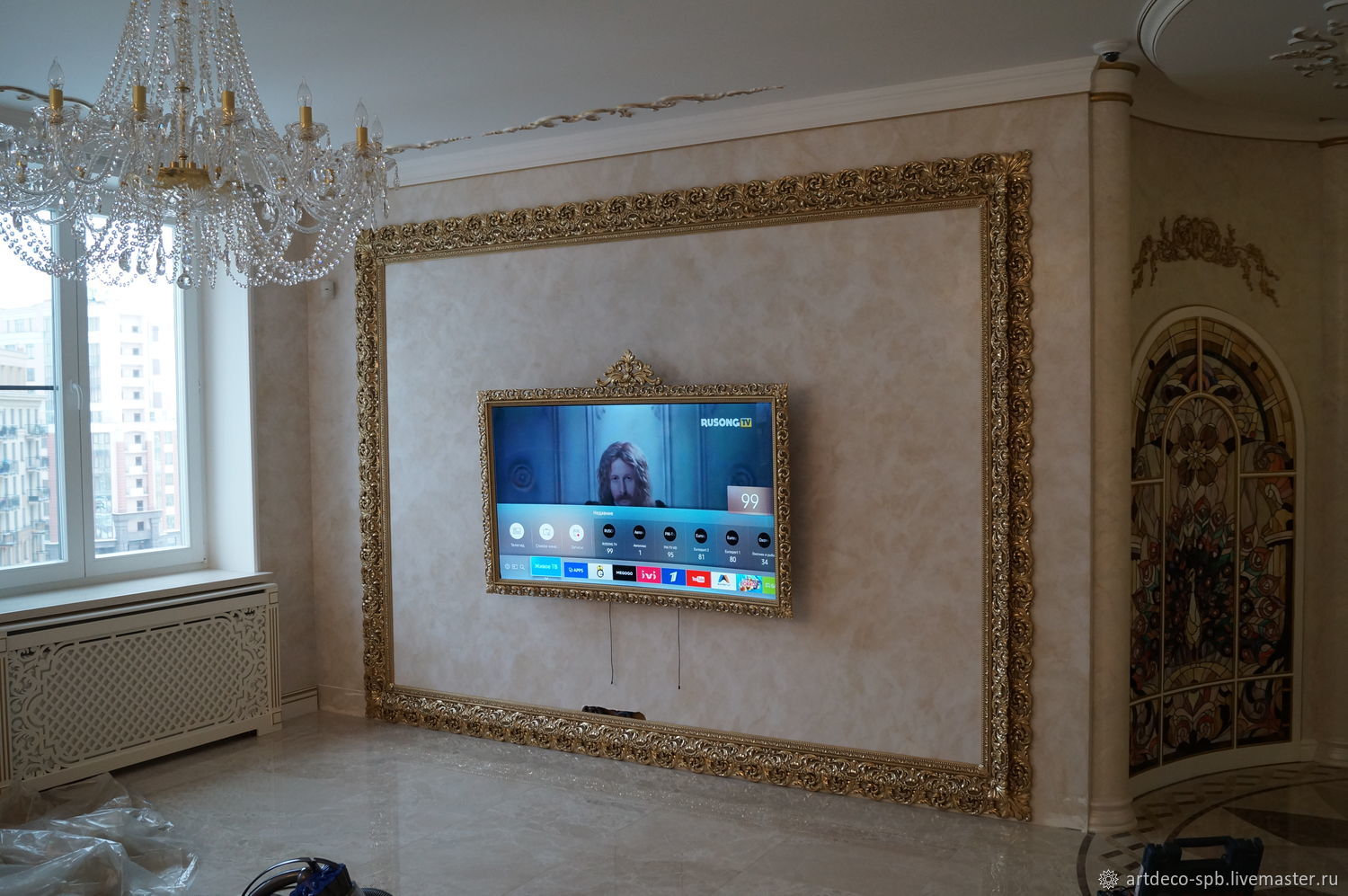 Багет под телевизор можно смастерить самостоятельно или заказать в мастерской. Рамка плотно прилегает к телевизору, практически составляя с ним единое целое, и под ней можно спрятать не только провода, но и розетки, и кронштейн.