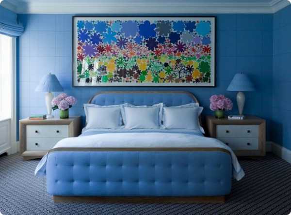 Некоторые считают, что он помогает в омоложении и исцелении. Спальня в синих тонах создает ощущение прохлады в летнее время. Комната наполняется свежестью.