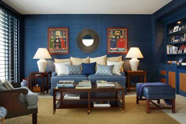 Умеренно насыщенный синий можно использовать как основной тон и для небольшого, и для просторного помещения.