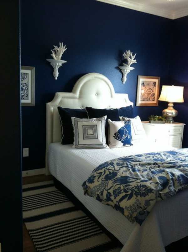 белый цвет в тёмно-синей спальне визуально делает помещение более легким и воздушным