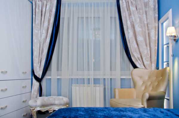 А белые окна хорошо украсит воздушная легкая тюль, можно использовать оттенки светло-синего цвета или чистый белый цвет, также подойдут и синие шторы в спальню.