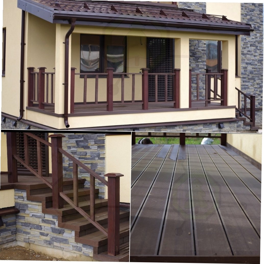 Преимущество балкона в том, что его можно пристроить к уже готовому дому: поставить столбы, сделать настил, ограждения и, при желании, кровлю. По той же схеме строятся объемные террасы, при этом часто и на первом этаже пространство облагораживается, застилается декингом, и вуаля – новая столовая-гостиная готова.