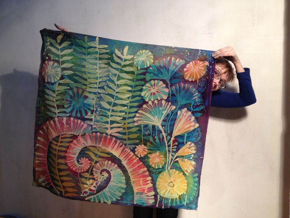 Финская художница и блогер Мирка Хокканен рассказывает и показывает, как окрасить в технике сибори большой отрез ткани. В двух частях: 1, 2.