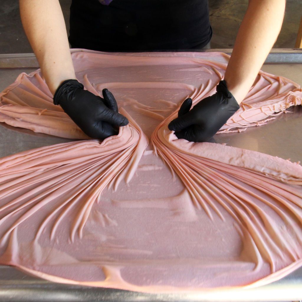 Продолжайте обматывать, разгибать и затягивать до тех пор, пока ткань не будет уплотнена. Завяжите узел над тканью. Выкройка будет по диагонали с тонкими белыми линиями там, где шпагат связывает ткань.