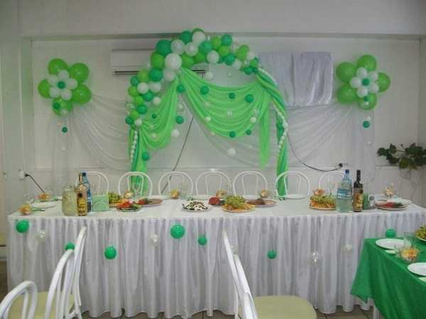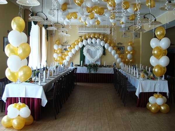 Такие украшения из шаров подходят для многолюдных свадеб, ведь одна оформленная стена рядом со столиком молодых не будет видна всем гостям. В этом случае небольшой букетик из шаров с гелием поставим на каждый столик. Нити должны быть достаточно длинными, чтобы гости могли видеть лица друг друга.