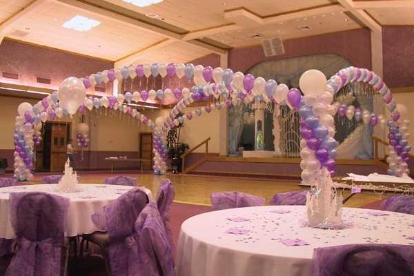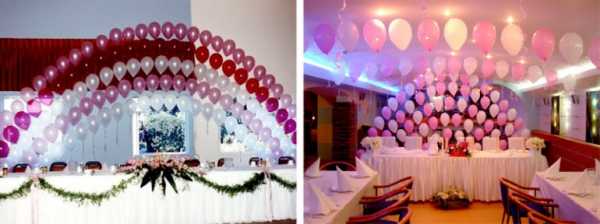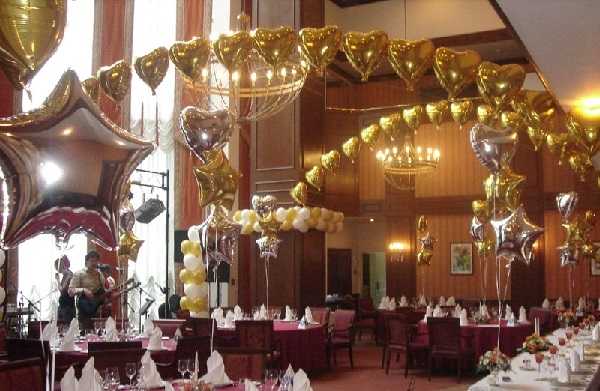 Висящие над головами цепочки из шаров делают любое помещение похожим на сказочный замок. Это очень удобное решение, когда надо поделить зал на несколько зон – для танцев, для отдыха, для еды.