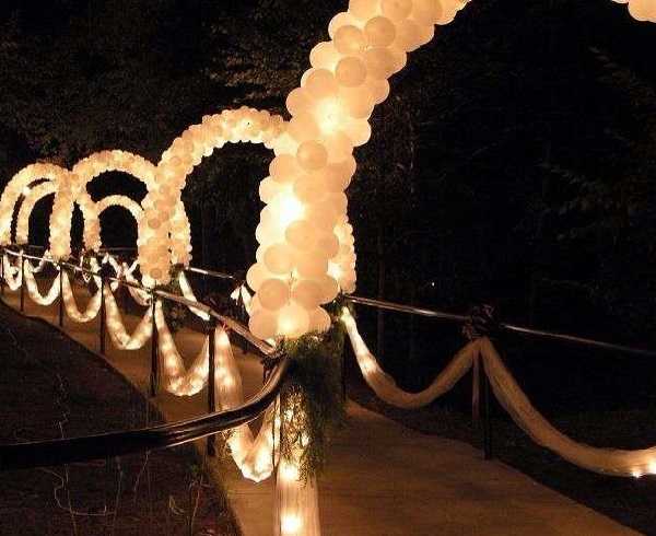 Из цепочек можно соорудить тоннель (утяжелители прикрываем бумажными цветами или лентами). А если шары прикрепить не к леске, а к перилам, получится очаровательное украшение лестничного пролета. Кстати, именно эти шары можно использовать в конце праздника для запуска в небо :-).