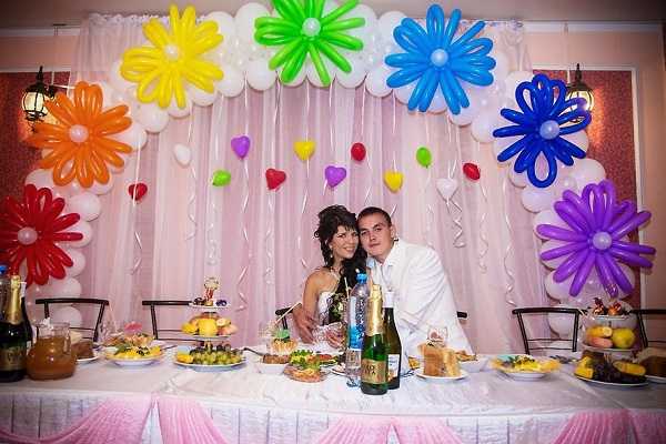 Длинные и легко сгибающиеся шары для моделирования – отличный вариант для создания самых неожиданных композиций. Из них можно сделать шаржевое изображение новобрачных и установить на столе или в центре зала. Не хуже смотрится букет или целая клумба цветов, любые иные фигурки: от ангелочков до голубей.