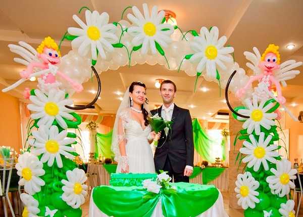 Очень интересным решением, разом милым и забавным, становится создание из фольгированных шаров кукол жениха и невесты, уменьшенных или даже в полный рост. Такой элемент декора чудесно украсит как президиум, так капот свадебного кортежа.