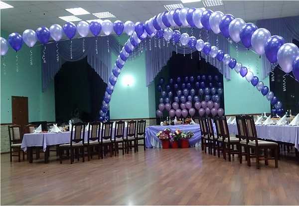 Небольшие шарики, наполненные гелием или обыкновенные, отлично собираются в разнообразные фигуры. Их можно закрепить на стене президиума, выложить на столах, подвесить к потолку.