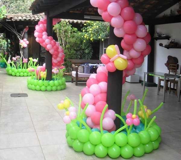 В одинаковой степени, как для новичков, так и для профессионалов, самым распространенным оформительским приемом, в котором участвуют шары, является гирлянда из воздушных шаров. Данная комбинация из шариков представляет собой цепочку сложенных определенным образом шариков разных цветов и размеров. Простая гирлянда, состоящая даже из двух цепочек шаров, способна преобразить помещение и быстро приготовить его к праздничному моменту. Если шары наполнены гелием, а гирлянда из шаров установлена на улице, то это позволит создать живую картину у входа в здание: шары устремляются в ввысь, а ветер развевает их на ветру.