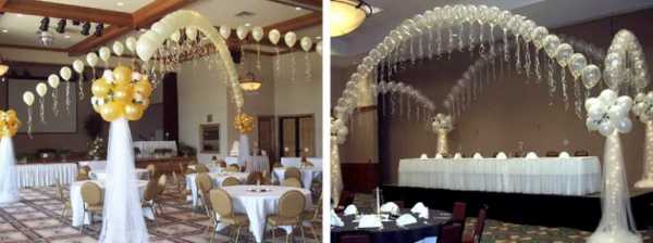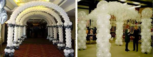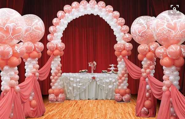 Это самые монументальные конструкции из шаров, на их монтаж уходит достаточно много времени. Чаще всего такие арки и беседки строят в больших помещениях с высокими потолками или на свежем воздухе для проведения торжественной части свадебной церемонии.