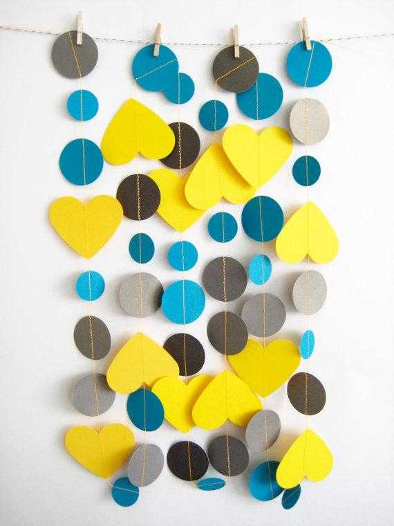 Заготовки могут быть другой формы, например квадратной или в виде сердечек. Очень интересный эффект дает обработка краев каждого круга фигурными ножницами. Гирлянду можно расположить горизонтально или подвесить отрезки вертикально.
