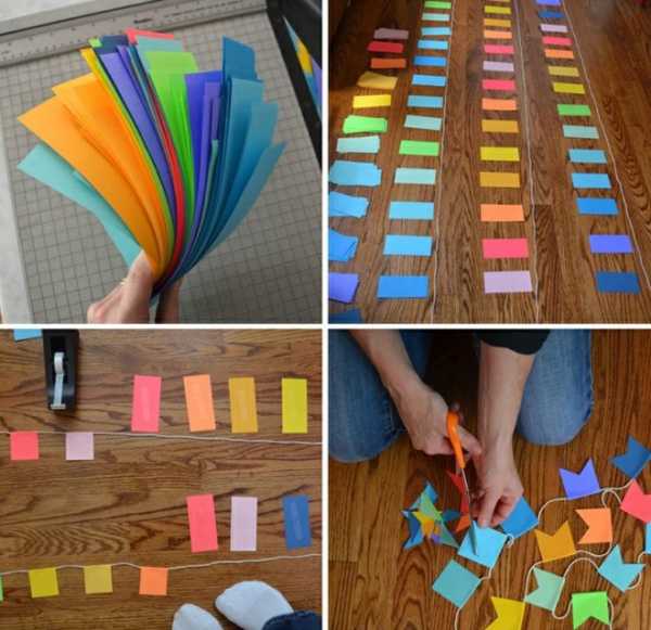 Процесс изготовления максимально прост: вырезаем нужное количество прямоугольников из цветной бумаги (стандартный размер 10х20 см), раскладываем на полу нить – основу и крепим бумагу, сворачивая каждый прямоугольник вдвое и фиксируя внутреннюю сторону скотчем или клеем. В завершении следует ножницами подрезать прямоугольники в форме флажков. Развешиваем творение вдоль стен или под потолком.