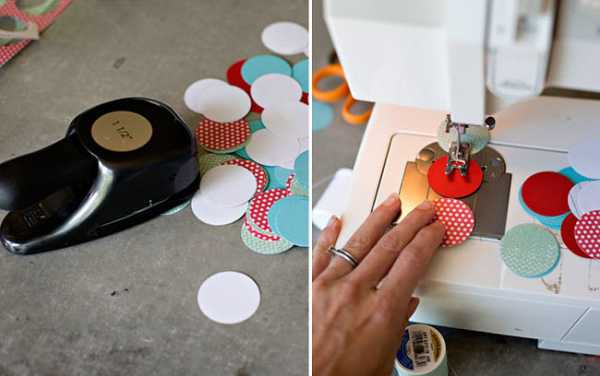 Детали будем вырезать в форме круга. Материал удобнее всего использовать двухсторонний и достаточно плотный (картон, фетр и т.п.). Чтобы вырезать много одинаковых кругов, используем циркуль или донышко стакана вместо шаблона. Когда нужное количество заготовлено, заправляем швейную машинку нитями подходящего цвета и прошиваем каждый круг точно по центру. Стежок стоит выбирать как можно более крупный. Если же бумага односторонняя, то детали перед сшивкой следует складывать попарно, цветной стороной наружу. Чтобы закрепить гирлянду в помещении, не забудьте оставить достаточно длинные нити на концах конструкции.