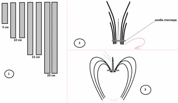 - Далее вновь по обе стороны от уже сложенной бумаги добавляем полоски длиной 15 см и 10 см. Должна получиться стопка, в которой центр – бумажная петля с нитью, далее наиболее длинные полоски, средние и самые короткие должны оказаться на краю.