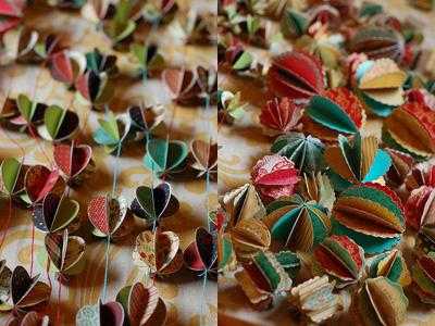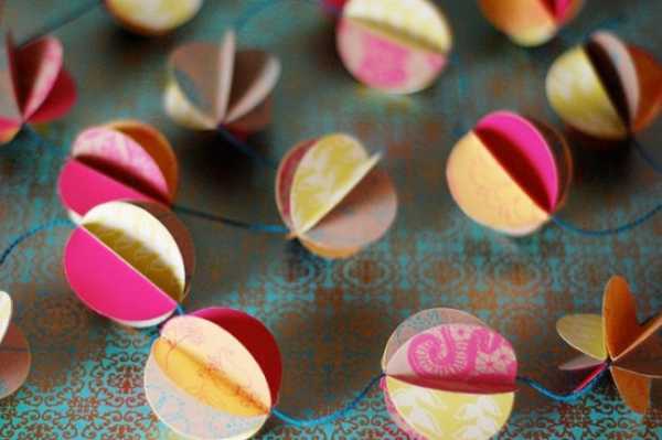 Бумажные гирлянды могут быть плоскими (флажки на нитях) или объемными (шары, цветы и помпоны). Детали между собой обычно крепятся посредством нити или соединяются клеем.