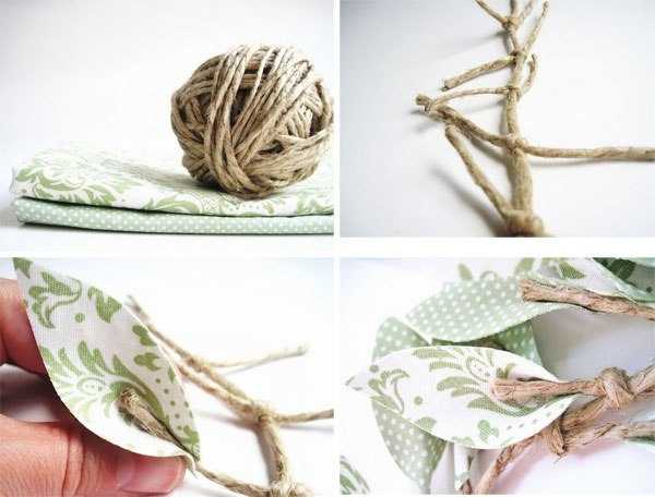 - Берем вырезанные листья. Каждый из них сворачиваем вдвое и в центр вкладываем кончик тех отрезков бечевки, которые мы завязывали узелками. Закрепляем листочек термоклеем. Прорабатываем всю гирлянду, облагораживая ее листвой.