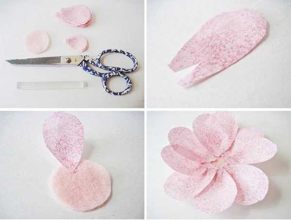 - Вырезаем из ткани листья и лепестки (лепестки большого и маленького размеров в форме капель).