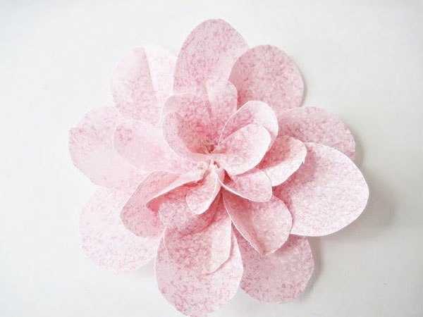 - Приступаем к сборке цветка. Берем кружок фетра и по кругу располагаем лепестки, начиная с самых больших и заканчивая самыми маленькими в сердцевине цветка. Закрепляем лепестки термоклеем.
