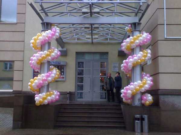 Самый простой и оптимальный вариант для оформления входной группы недавно открывшегося магазина – украшение гирляндами из шариков. Воздушные шары наполняются воздухом при помощи специального компрессора и собираются в строгом порядке, образуя своеобразные трубы, «раскрашенные» цветным орнаментом.