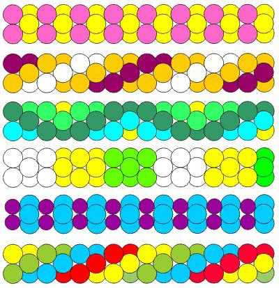 Круглые гирлянды выполняются из шаров, раздутых на единый размер. Ниже приведены рисунки, иллюстрирующие основные схемы плетения круглых гирлянд.