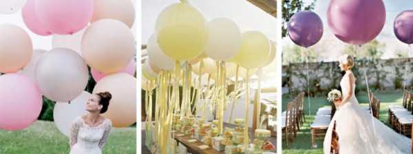 Бесподобное решение для свадебного декора! Особенно мне нравится, когда к этим огромным шарам (диаметр 40-50 см) привязывают широкие яркие ленты. Украшение получается достаточно заметное, согласитесь.