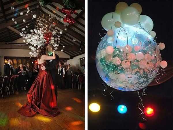 Внутри огромного шара (90-100 см) размещается много-много маленьких шаров, серпантин, конфетти и мягкие игрушки. В принципе, его можно проткнуть и зубочисткой, чтобы во время первого танца шар взорвался и осыпал молодых всей этой радостной мишурой, но лучше заложить в шар специальный детонатор с пультом управления. Именно в этом случае шар-сюрприз оправдает свое название.