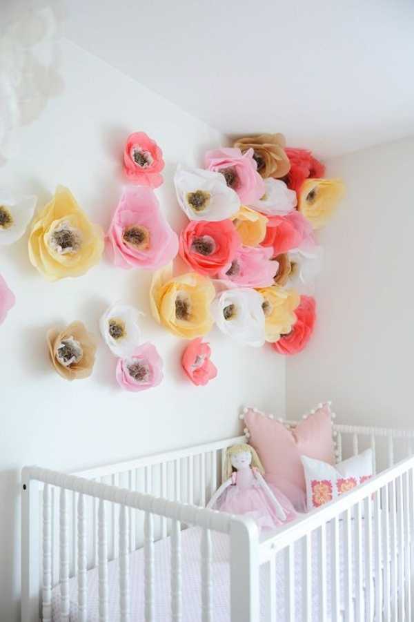 Для украшения стены больше подходят цветочные оригинальные элементы для декора из бумаги, как в плоской, так и объемной форме. Первая разновидность в основном состоит из большого количества деталей.