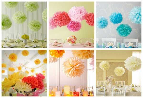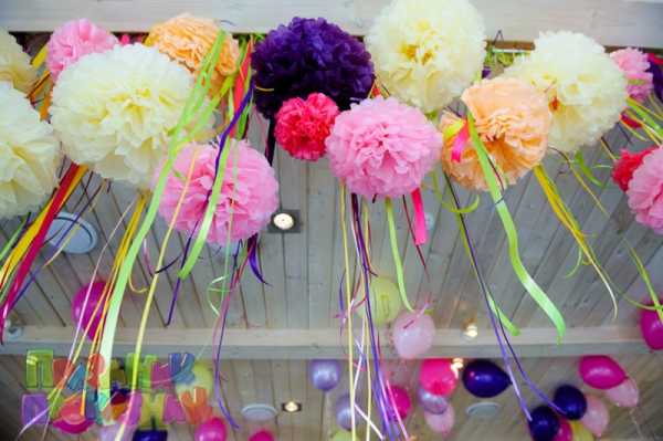 Ярко, недорого и легко можно украсить помещение для торжества бумажными помпонами из креповой бумаги.