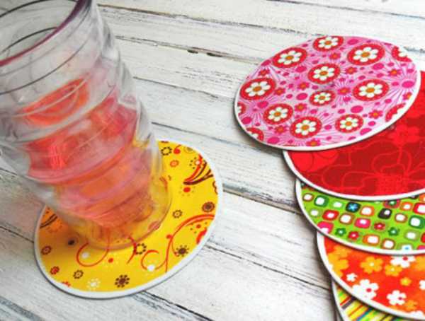 Если у вас дома есть много ненужных компакт дисков или же кафельной плитки, то сделайте подставки для посуды, также обклеив их верх декоративной бумагой.