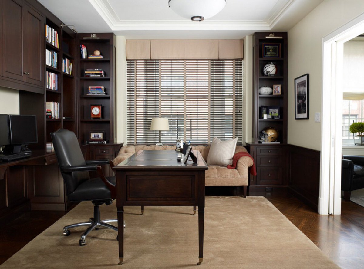 Наличие открытого офиса с кожаным креслом для отдыха — отличный способ украсить его в старинном стиле и придать ему изысканный, благородный вид.
