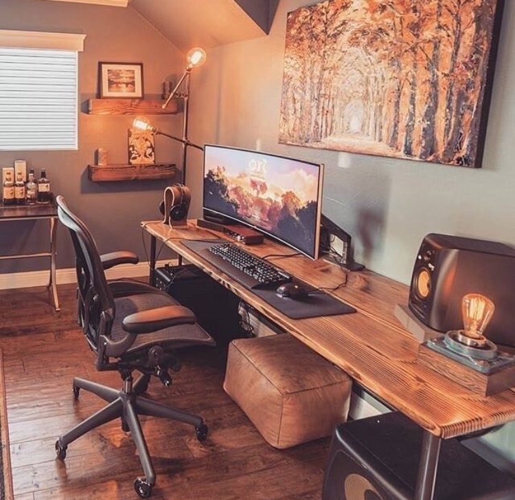 Сочетание деревенского и промышленного декора — настоящее удовольствие, но тем более, когда вы устанавливаете свой стол рядом с окном и можете любоваться им на солнце! Хорошо освещенный офис играет большую роль в производительности, так что используйте это окно с умом!