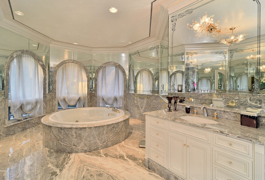 Состаренное зеркало на этой ванне напоминает о роскошном дизайне эпохи ар-деко, а мраморные стены создают ощущение роскоши, не умаляя красоты ванны.