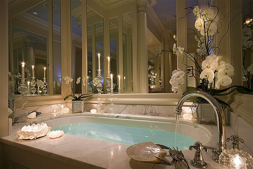 Дизайнер Дж. Рэндалл Пауэрс сочетает в этом доме в Хьюстоне принципы классического дизайна с изящным чувством интимности. Элегантная ванна в ванне жены от Lalique для THG. Люстры и бра от Nesle, стены и потолок из бумаги Gracie, а абажур из шелковой тафты Classic Cloth.