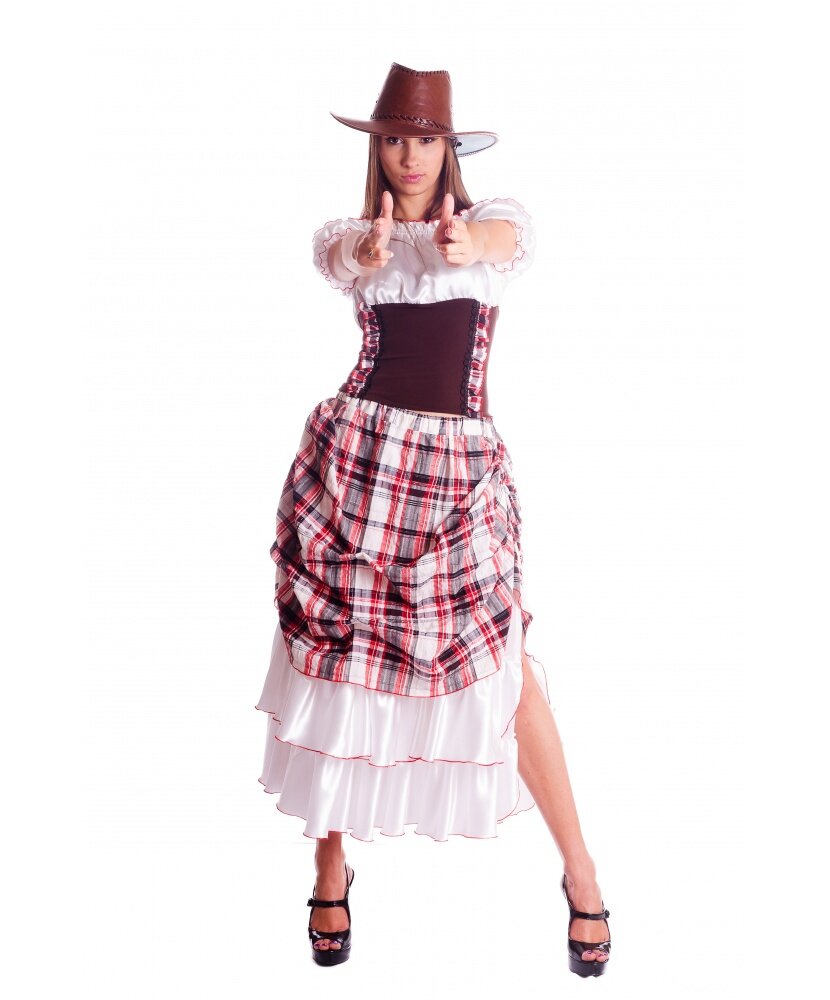 - Юбка. В традиционном женском варианте актуальна длинная клетчатая юбка со складками. К ней можно надеть ремень, ковбойские сапоги и шляпу, а также однотонную легкую блузку.