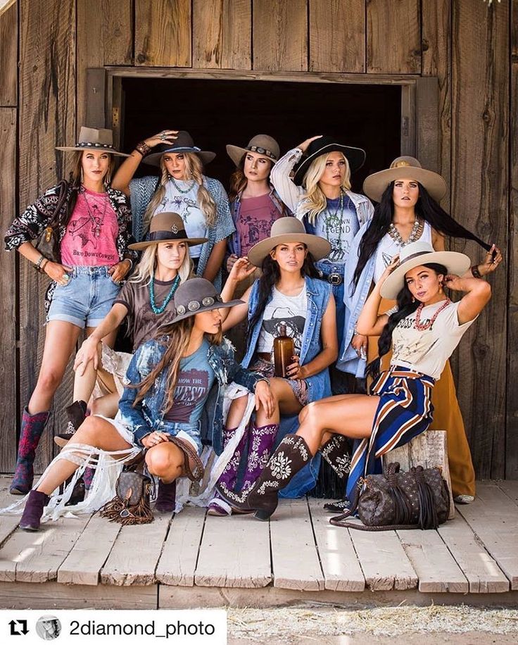 - Одежда — джинсы, длинные юбки в пол, рубашки в клетку, жилетки, сапоги, шляпы, шейные платки, звёзды «шериф».